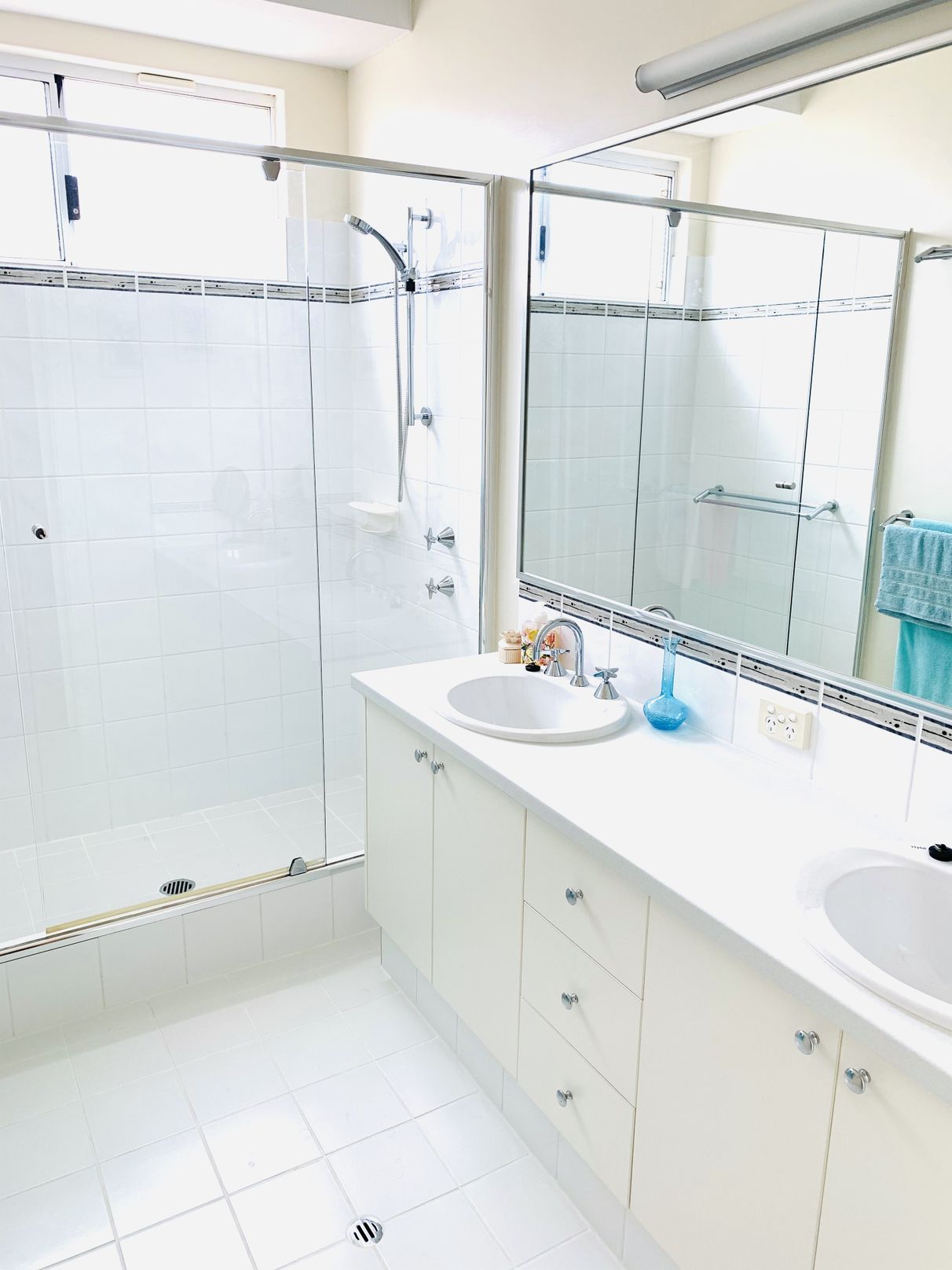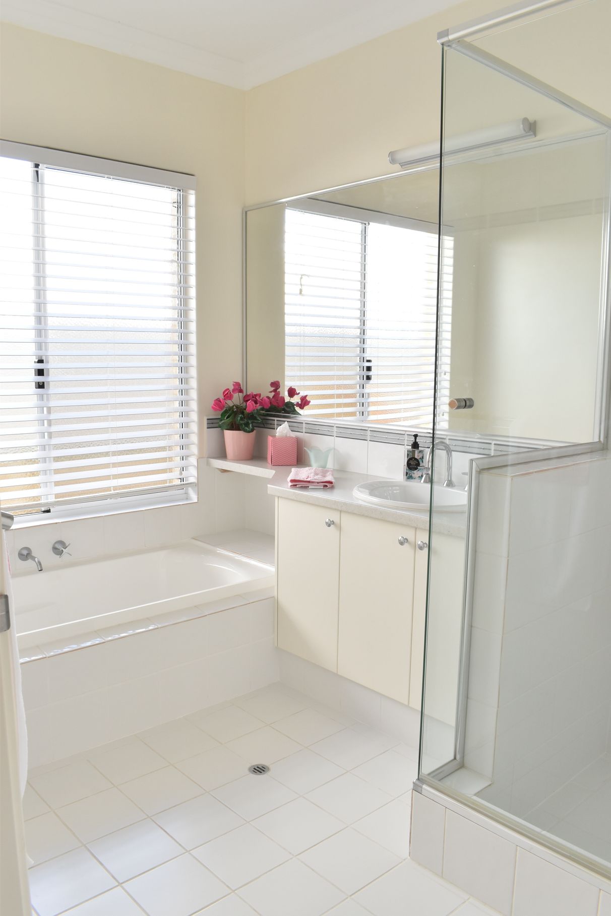 Main bathroom with bath, glass shower screen and vanity