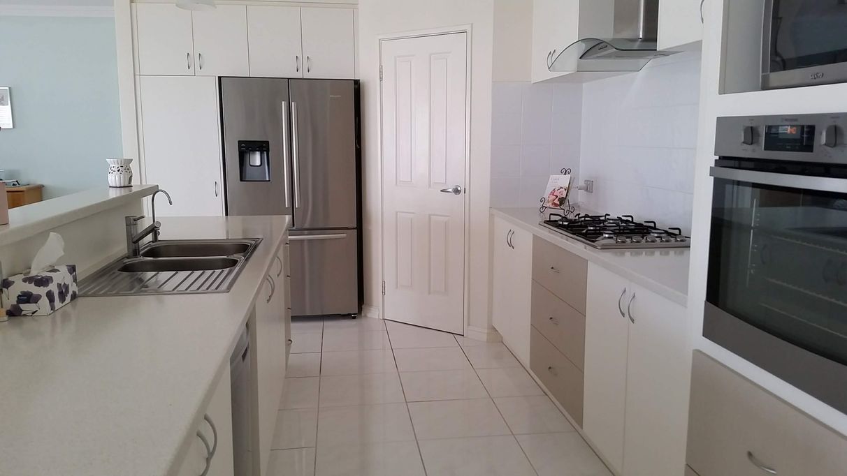 Spacious light kitchen with s/s electric wall oven, microwave recess, 900mm s/s gas hot plate, s/s dishwasher, water filter, walk-in pantry, wall cupboards and drawers, space for a large refrigerator and it all looks over a spacious north facing dining and living area