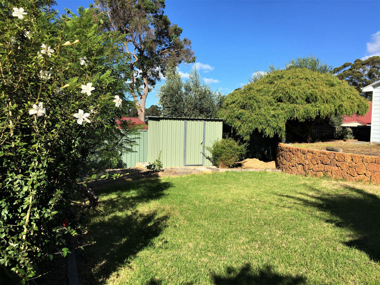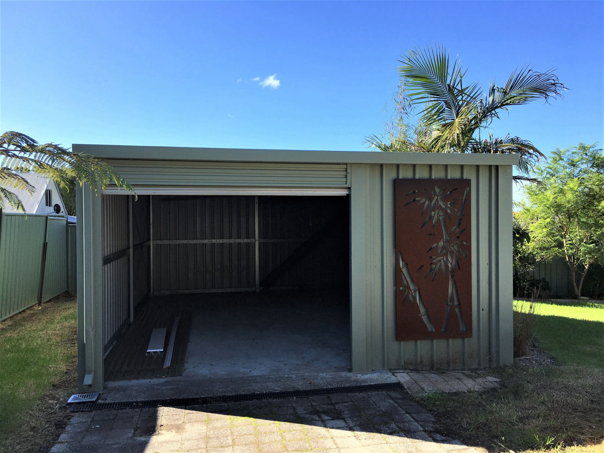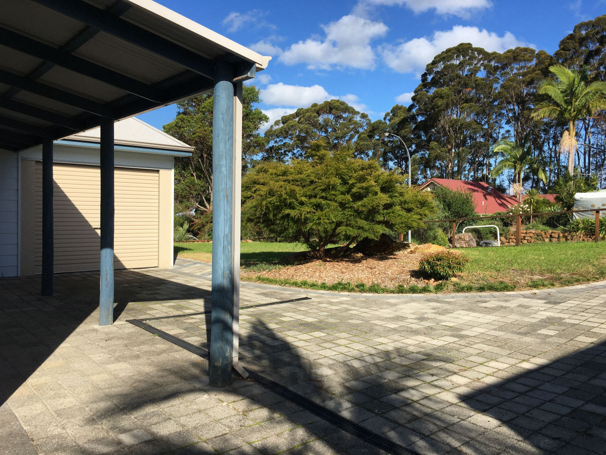 Small garden shed and large shed at rear. Single garage with remote at front. Driveway access to back shed, plenty of room for the caravan/boat. Well established gardens bordered with stunning stone mason built coffee rock walls.