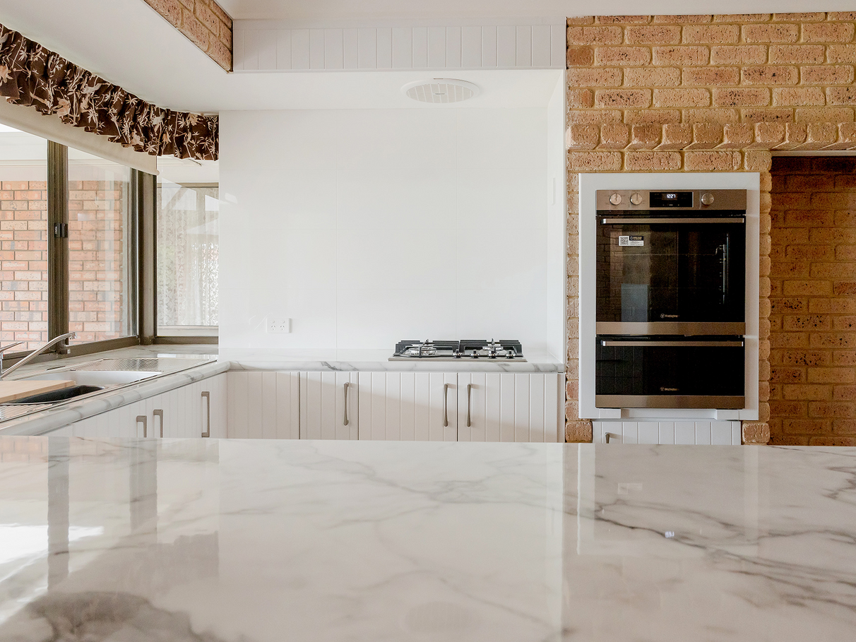 - Modern kitchen with bay window looking out onto covered entertainment area and back yard.