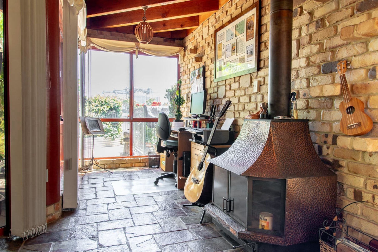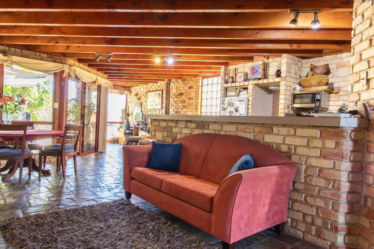 Upstairs living/entertainment area features a custom timber bar along with uninterrupted city views down the inlet.