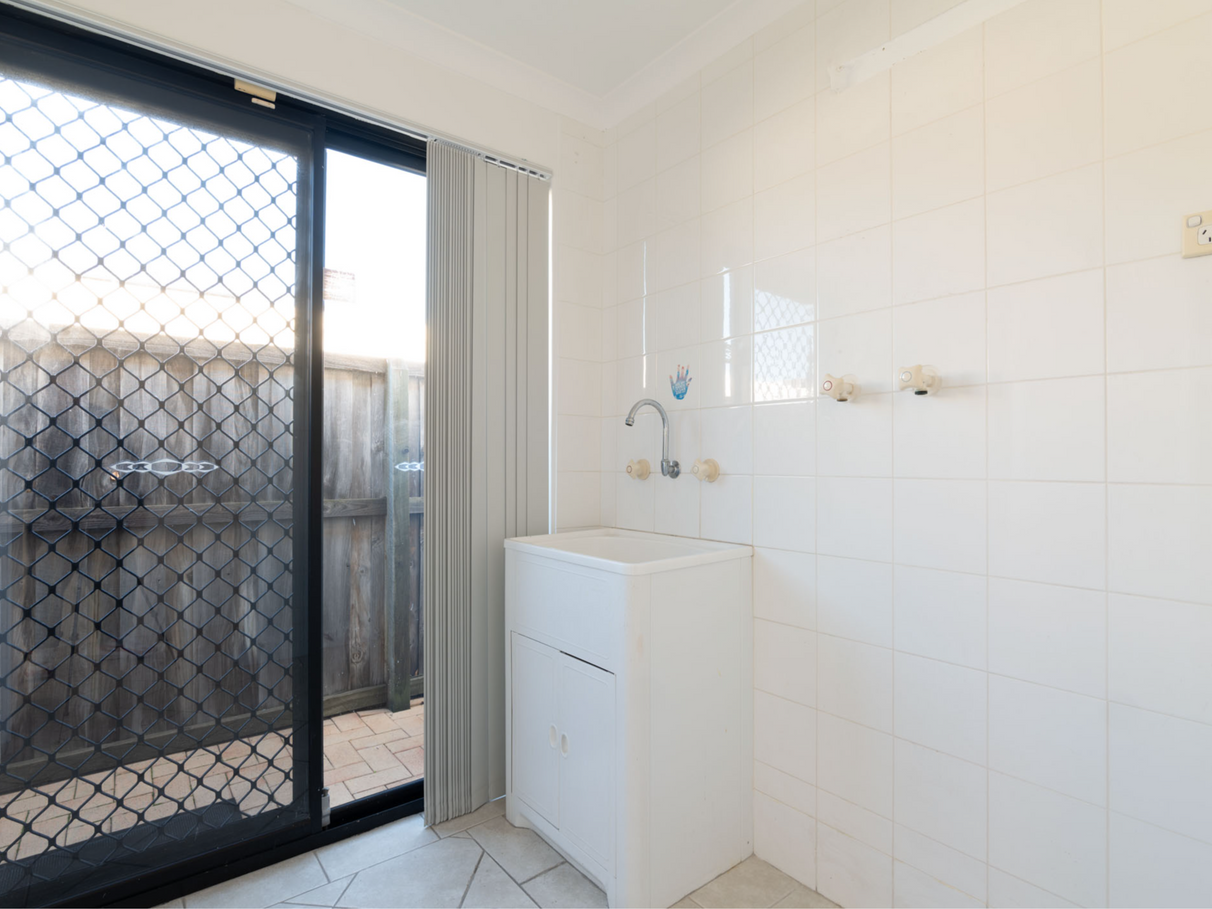 • Laundry room including a built-in sink and linen cabinet in the hallway for added storage convenience.