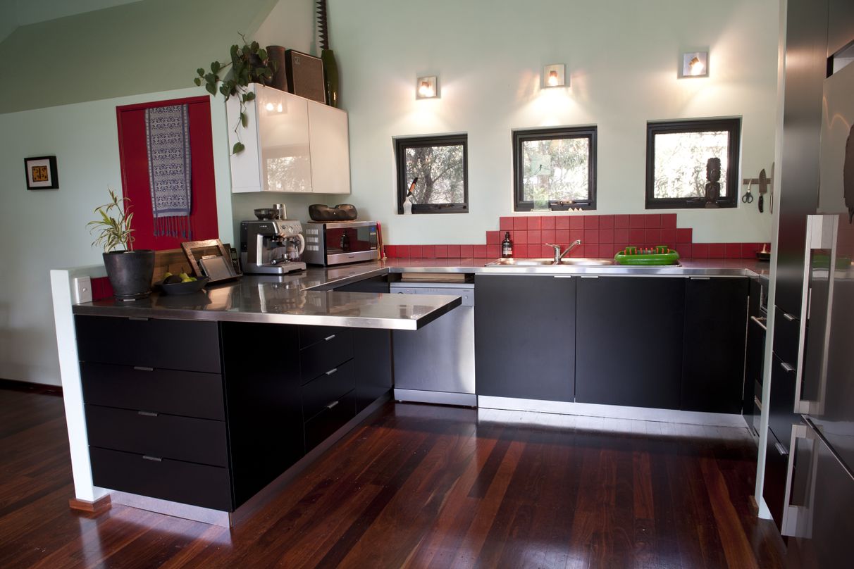 Scullery/laundry with beautiful recycled oregon benchtop and pressed tin splashback, plenty of storage, second toilet and space for a bar fridge.