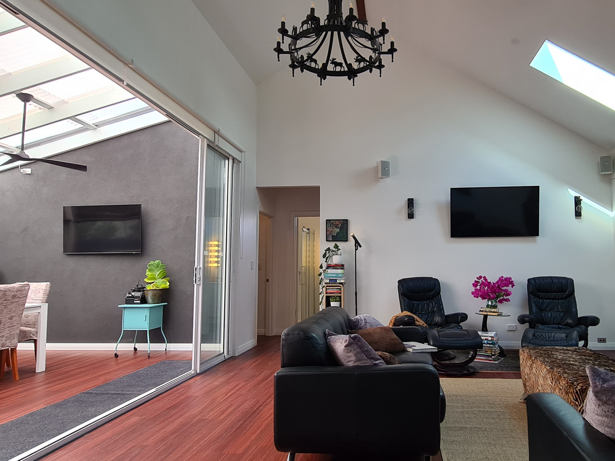 Inside, the home boasts 3m high ceilings with 3 bedrooms w built in robes, 2 bathrooms, office/foyer, walk in pantry, open kitchen dining or second lounge, a huge family room with feature stone wall and natural gas fireplace and a soaring ceiling peaking at 6m opening out to an adjoining alfresco/sunroom by 3m high, 5m wide custom glass stacker doors, copious amounts of storage and an attic.