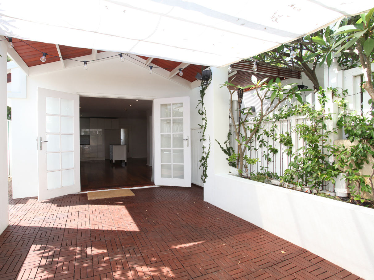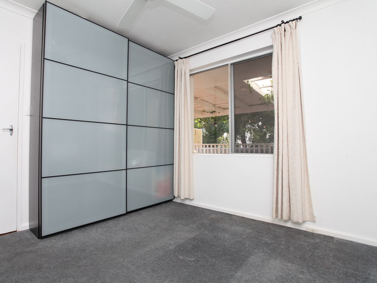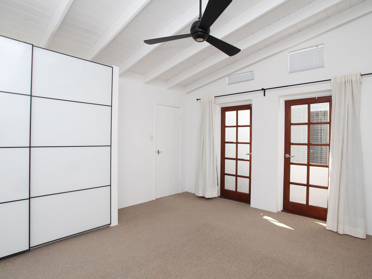 Two large bedrooms sit off the open plan living area and feature built-in wardrobes. They share a light-well and are equipped with quality fittings and fans. The front bedroom features a raked ceiling with exposed beams. The third, rear bedroom/study enjoys a private view to the back garden and trees beyond.