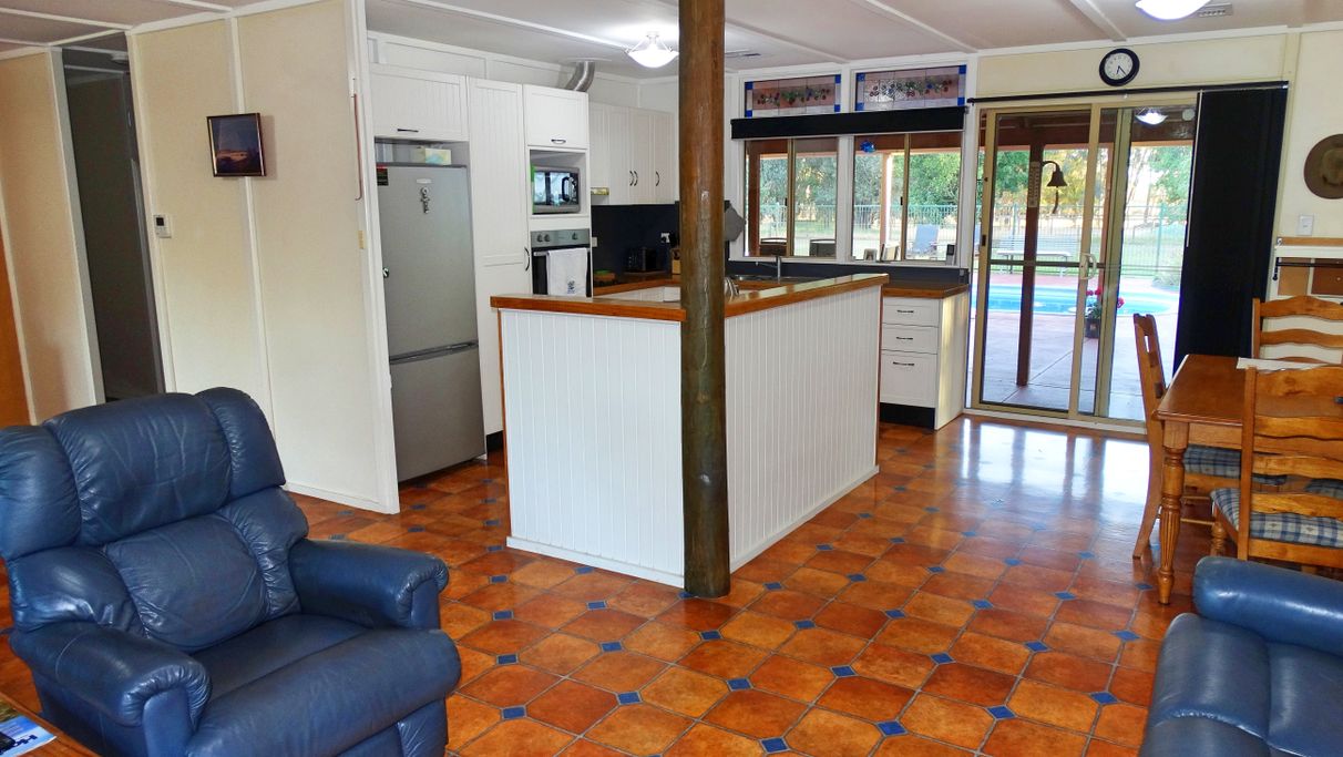 - Open plan lounge, dining and newly renovated kitchen looking out to the scenic views of the pool and property at the front and rear