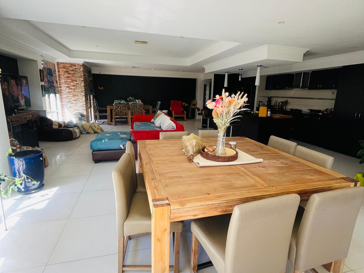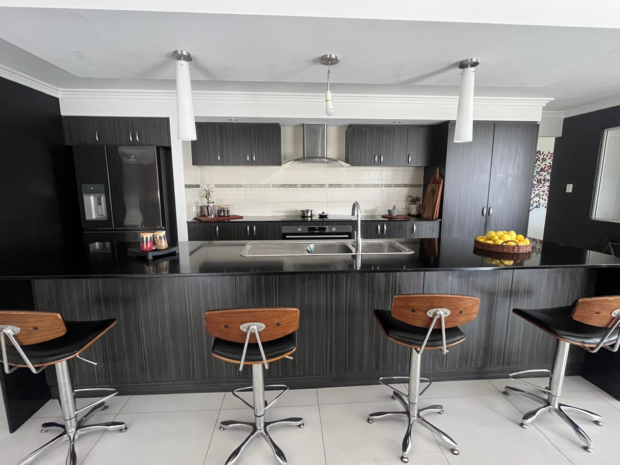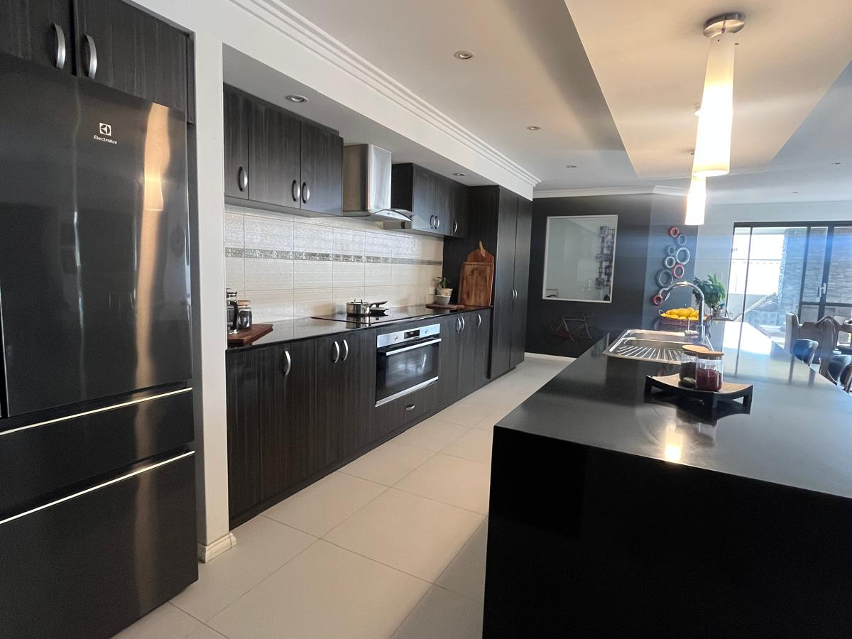 At the core of the home is a superb open-plan living area, where the chef's kitchen takes center stage with stone benchtops, stainless steel appliances, ample storage including a pantry, and a large island bench ideal for casual meals or hosting friends.