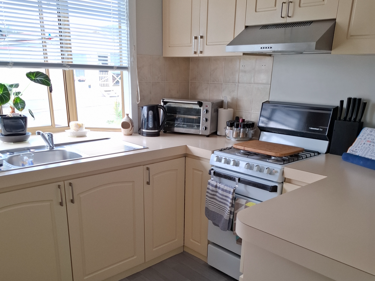 Well-appointed kitchen with full-size gas cooker, rangehood, pantry, ample