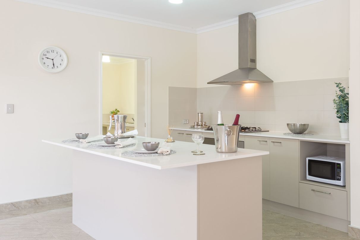 Chefs kitchen with spacious stone top bench separate for cooking and serving, soft closing cupboards