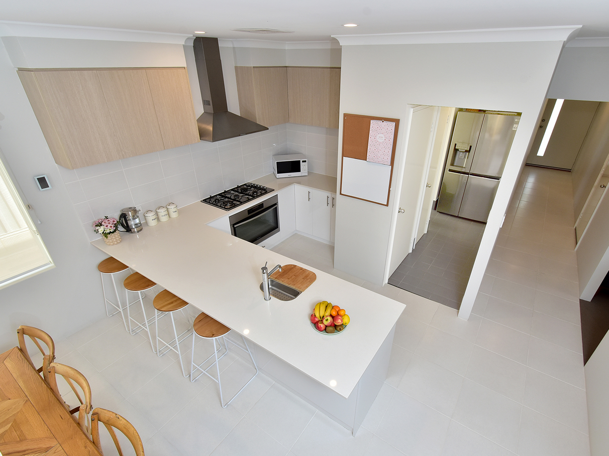 broad stone benchtops and breakfast bar, overhead cabinetry, 5 burner