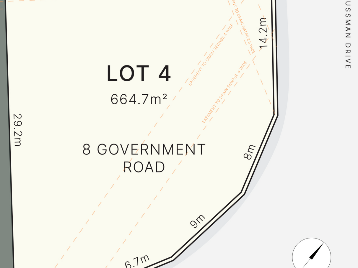 8 Government Road, Thornton, 664 sqm corner lot, $455,000 , with concept plan for a 4BR house and 2BR Granny Flat, subject to Council approval.