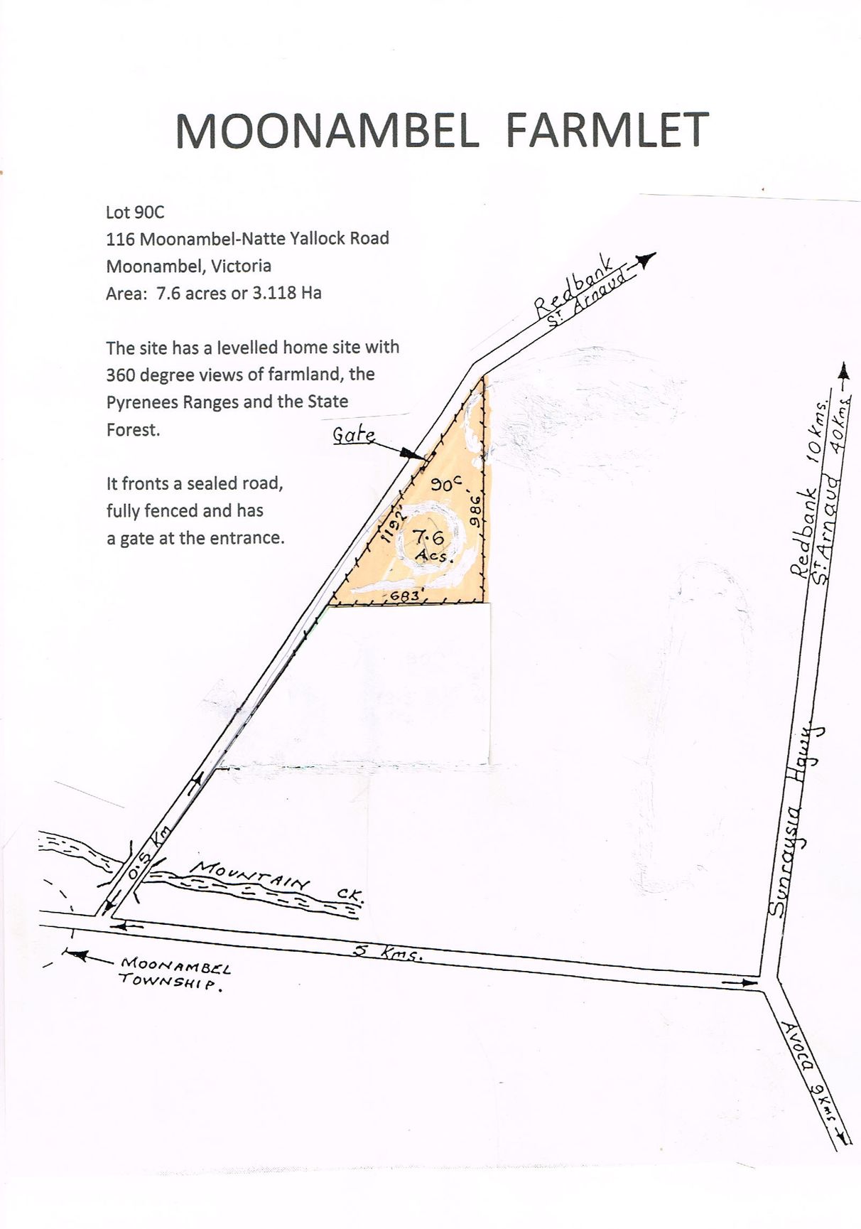 The site has a levelled home site with 360 degree views of farmland, the Pyrenees ranges and the State Forest.