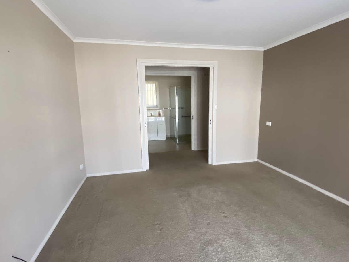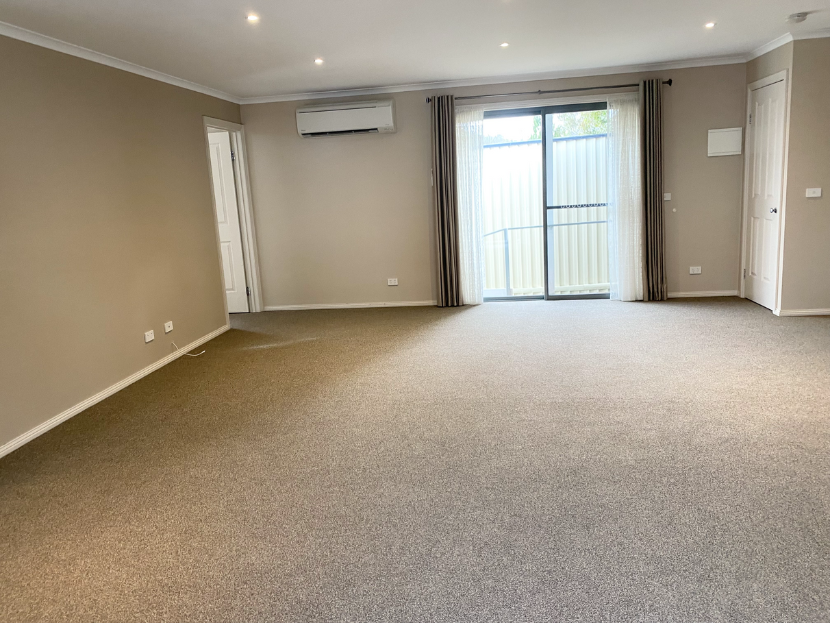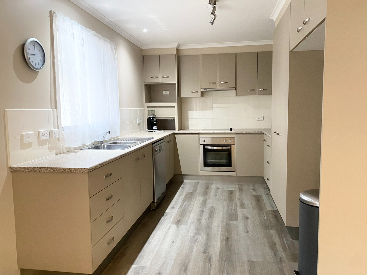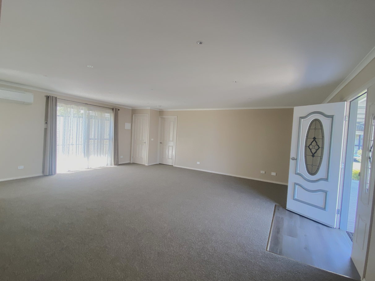The front door opens into the large living area (approx 6m x 7m) and there is a good sized kitchen to the left, boasting lots of storage and counter space, pantry and dishwasher, ample size for a large fridge and electric oven & cooktop.