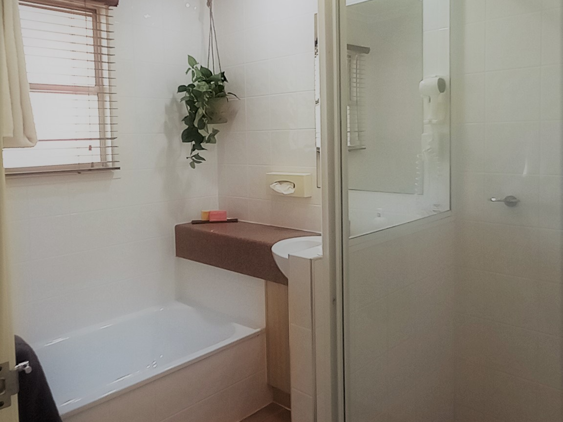 Modern bathroom with bath and separate shower, great for families with small children. A separate toilet area adjoins.