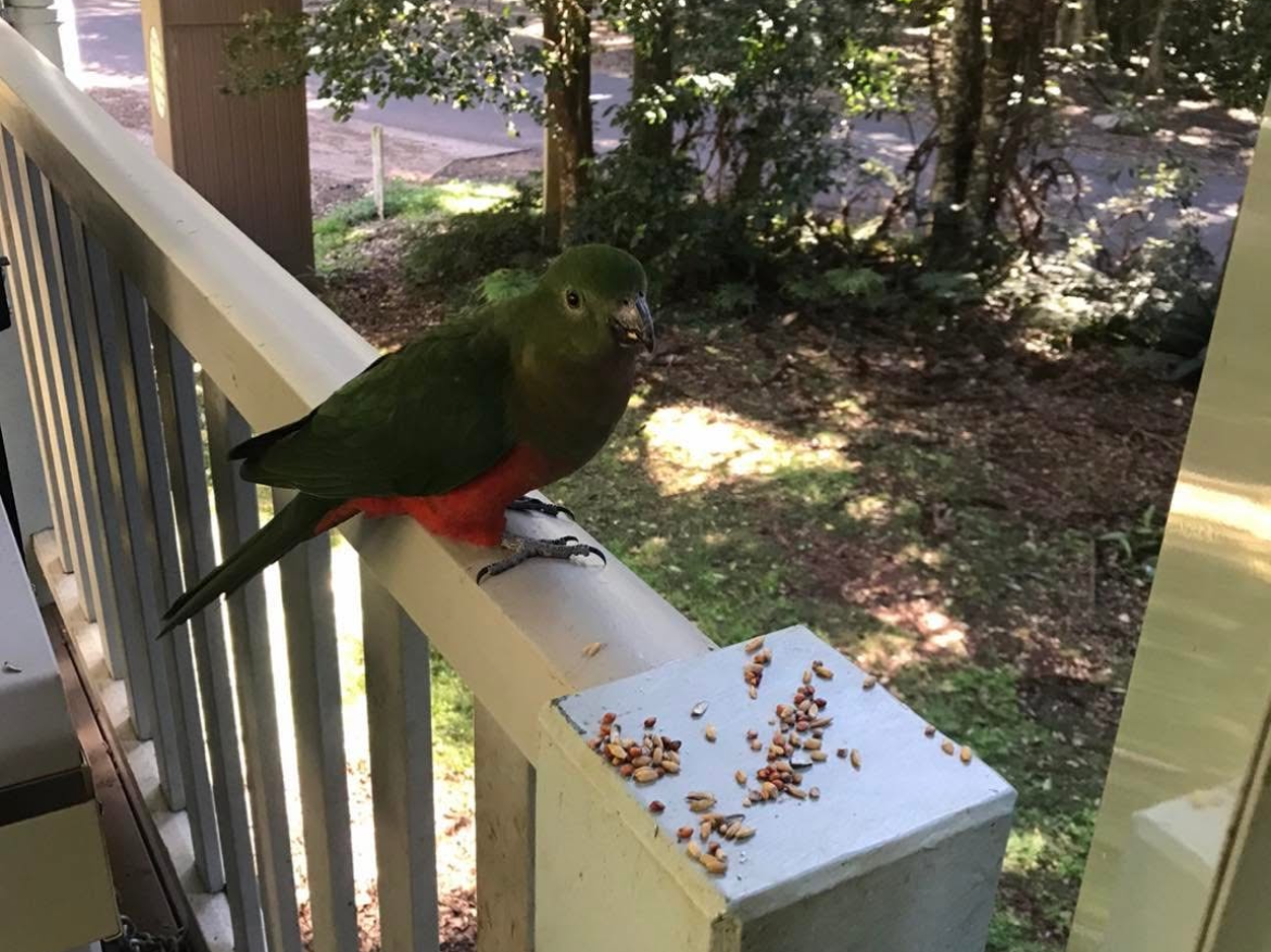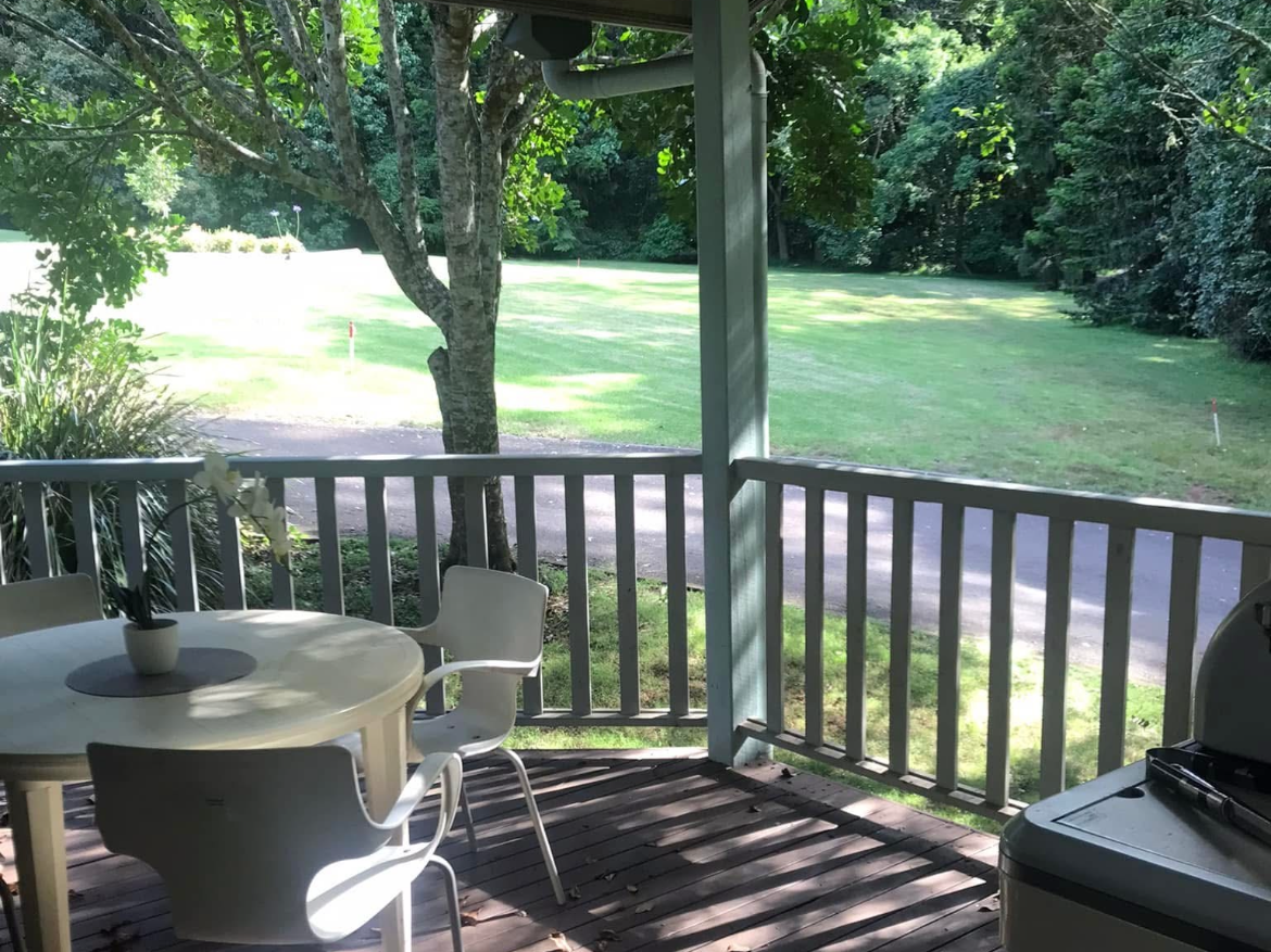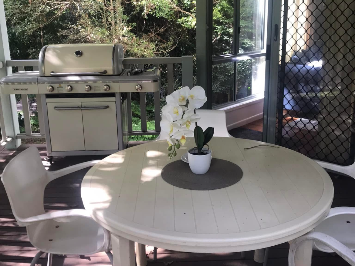A sliding glass door leads onto the covered deck which is equipped with bird feeders, BBQ, table and seating for four.