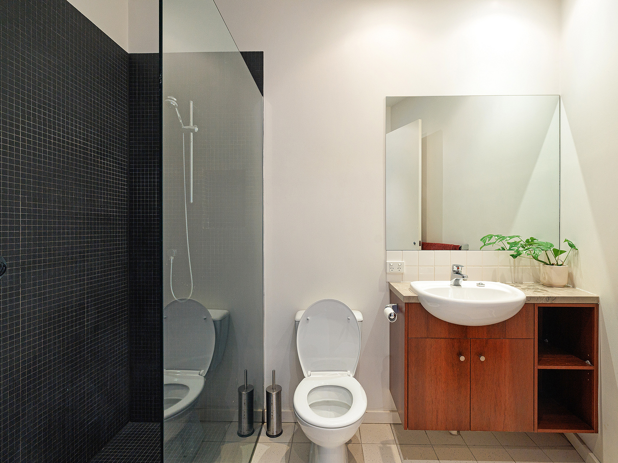 Master bedroom with ensuite including a large frameless shower as well as the dual flushing toilet and marble /turpentine vanity.