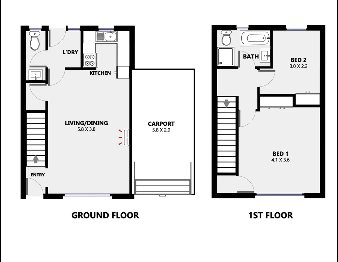 Upstairs you will find two bedrooms, both with built-in robes. The master bedroom a generous size with 3 lots of built in storage, although don't be mistaken, the second bedroom is also a good size with its built in robes. The plantation shutters continue to both bedrooms and bathroom. The bedrooms are carpeted for comfort with a modern carpet. The main bathroom is located upstairs and features a separate bathtub, shower and toilet. The home also features a single carport which you have approval to enclose as a garage and a second car park in your own driveway which is rare for similar properties, although there are public transport options at your doorstop including a nearby train stops at Ascot Park (5min walk), Mitchell Park (15min walk), Woodlands Park (15min walk) and the buses that run along Daws Road (1min walk).