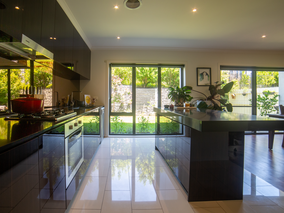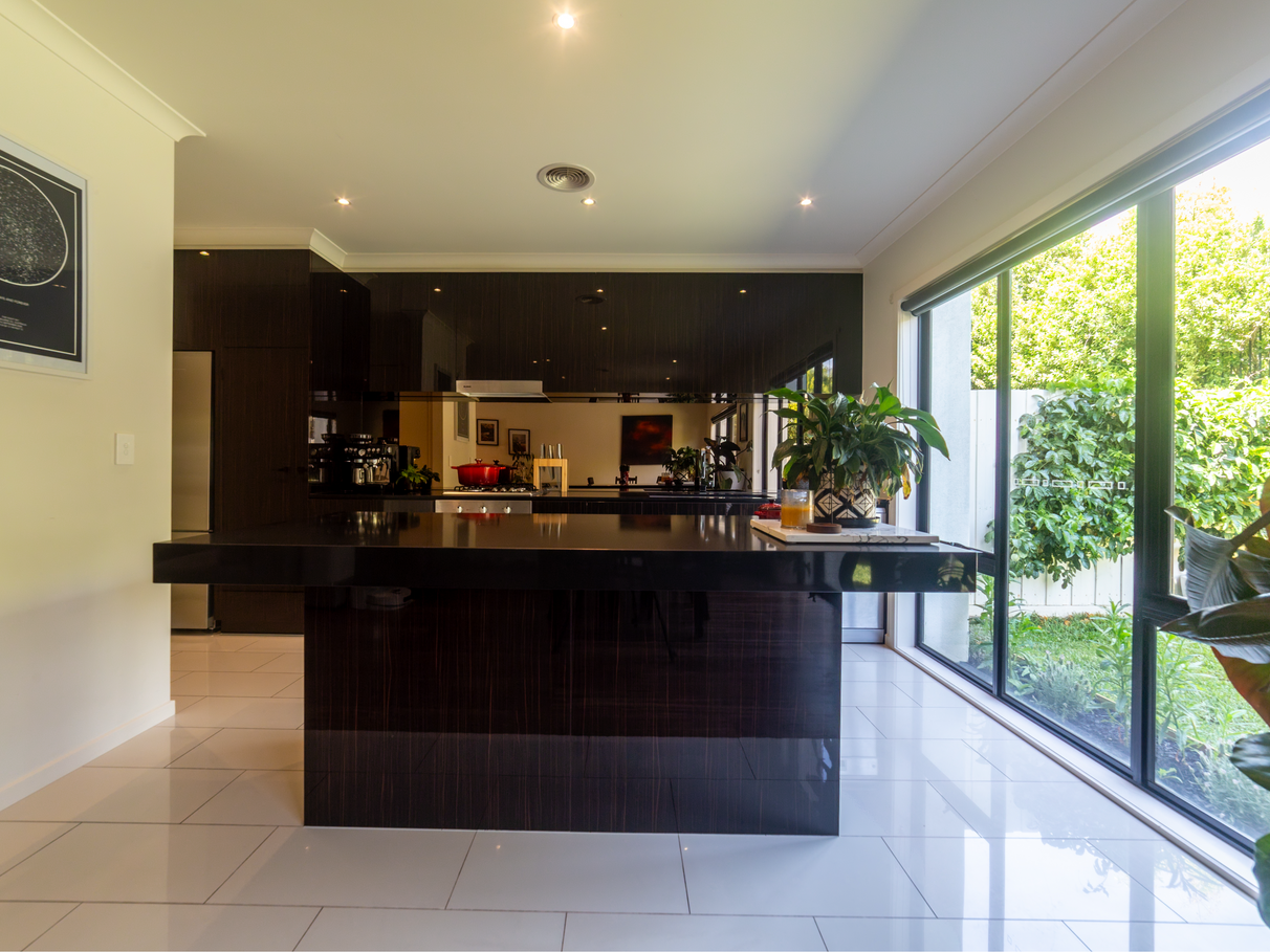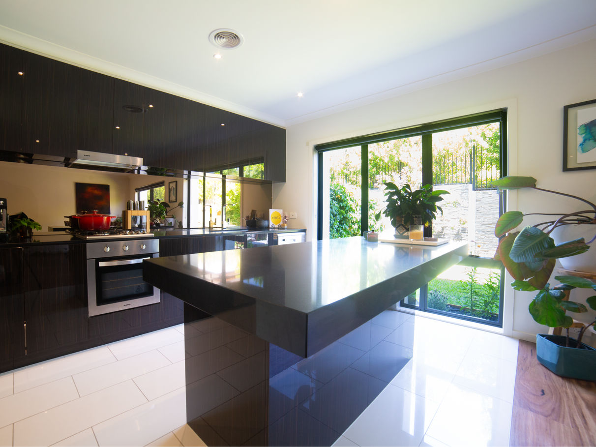 -Sleek Kitchen: The modern kitchen boasts elegant stone benchtops, an island bench, and stainless steel appliances, making it a chef's delight.