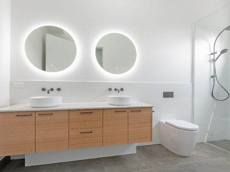 The master bedroom features a walk-in robe with ample shelving and drawers, leading to a luxurious ensuite including double vanity and LED lit mirrors