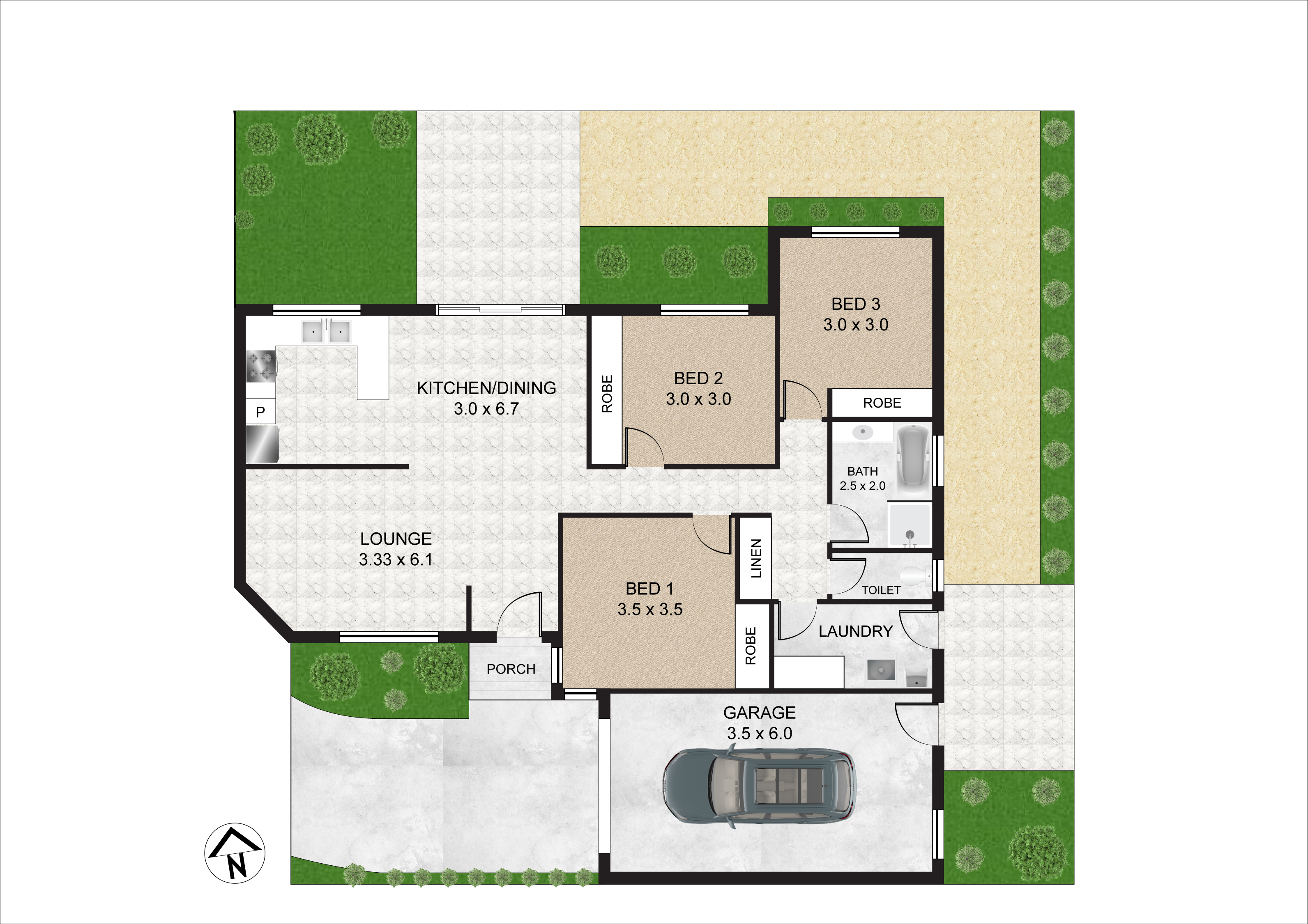 - Landscaped side and rear yards with paved area under retractable awning for alfresco dining.