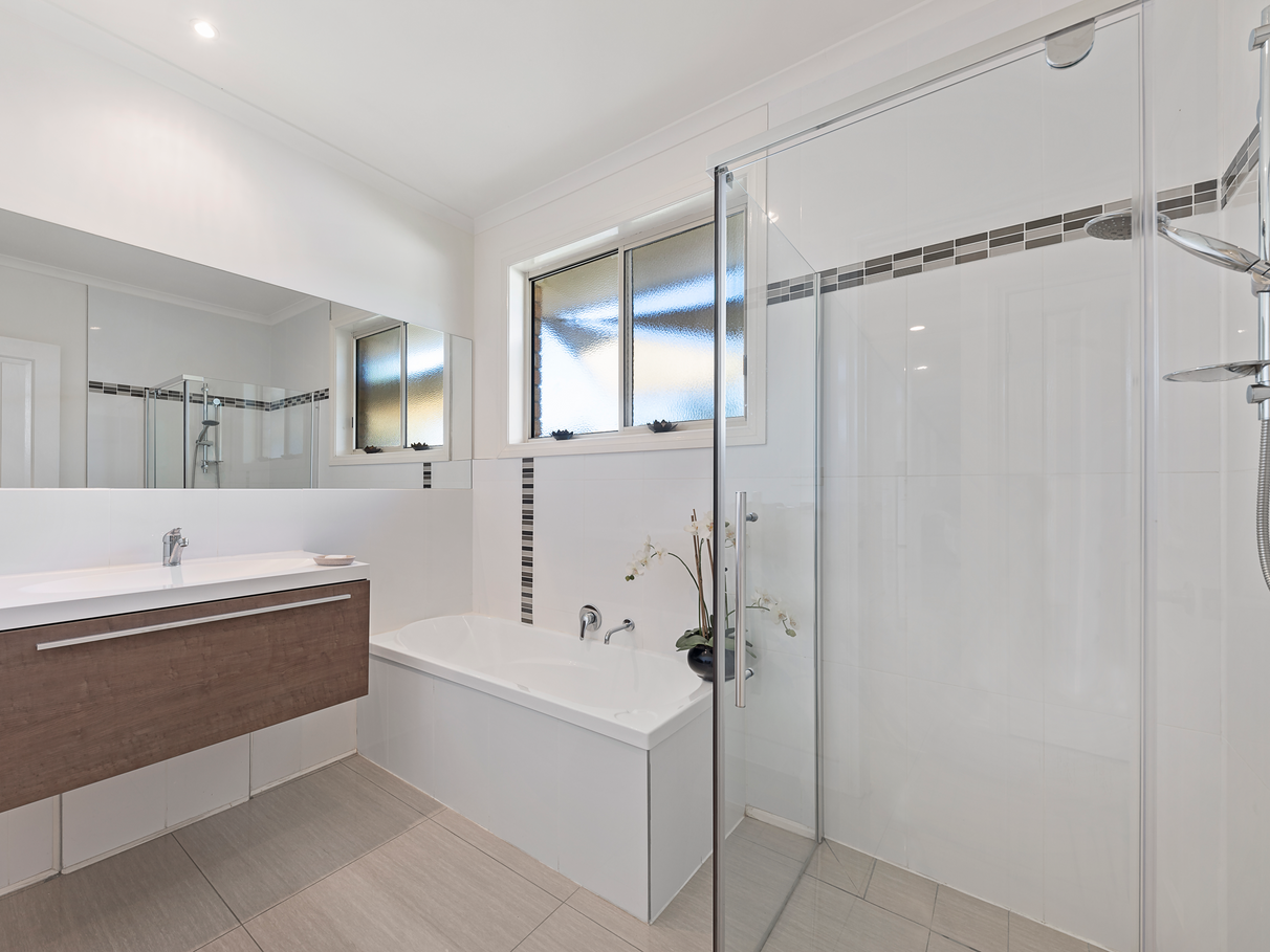 - Generous modern kitchen with drawers, reconstituted stone benches, & glass splashback.