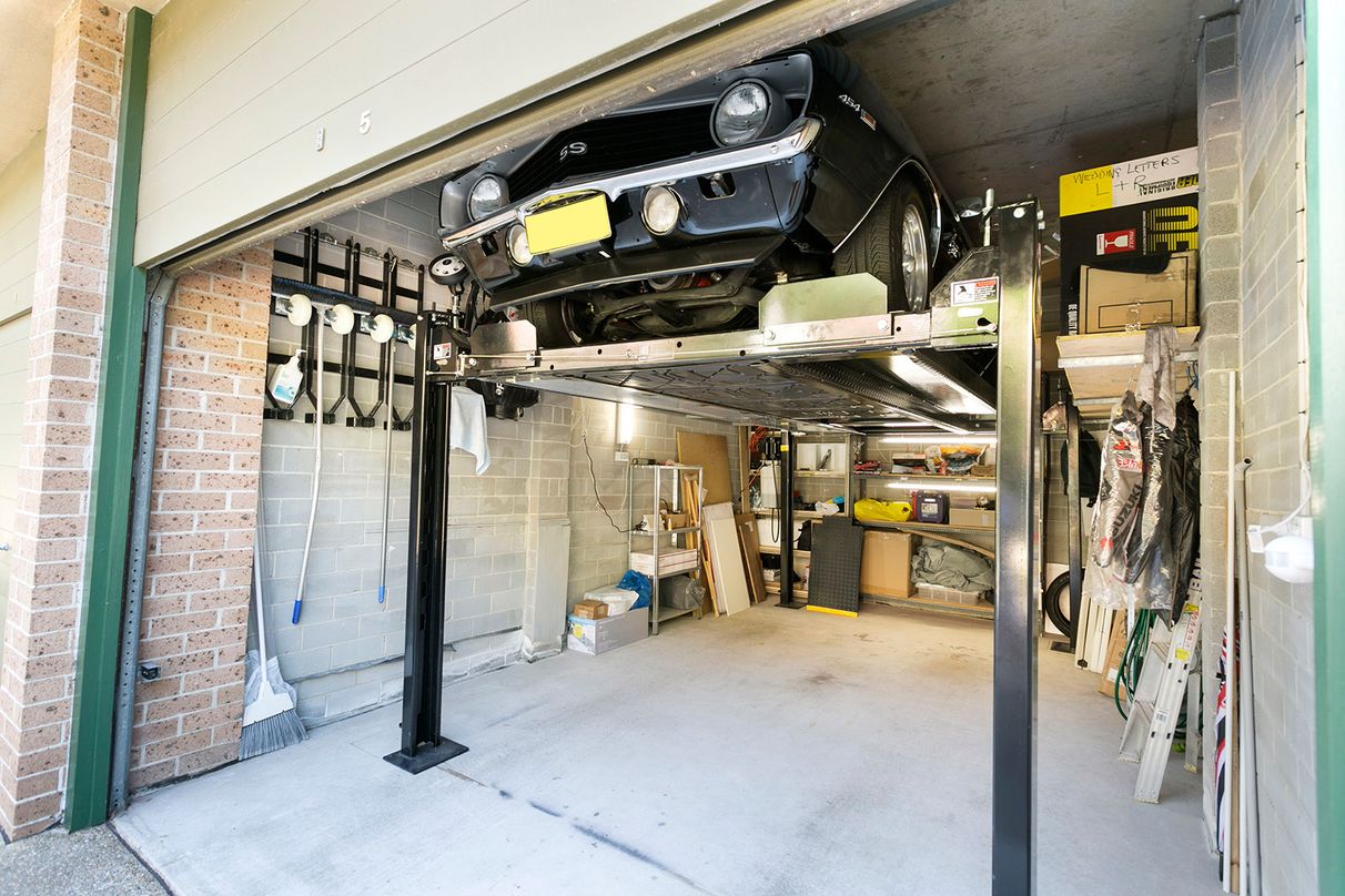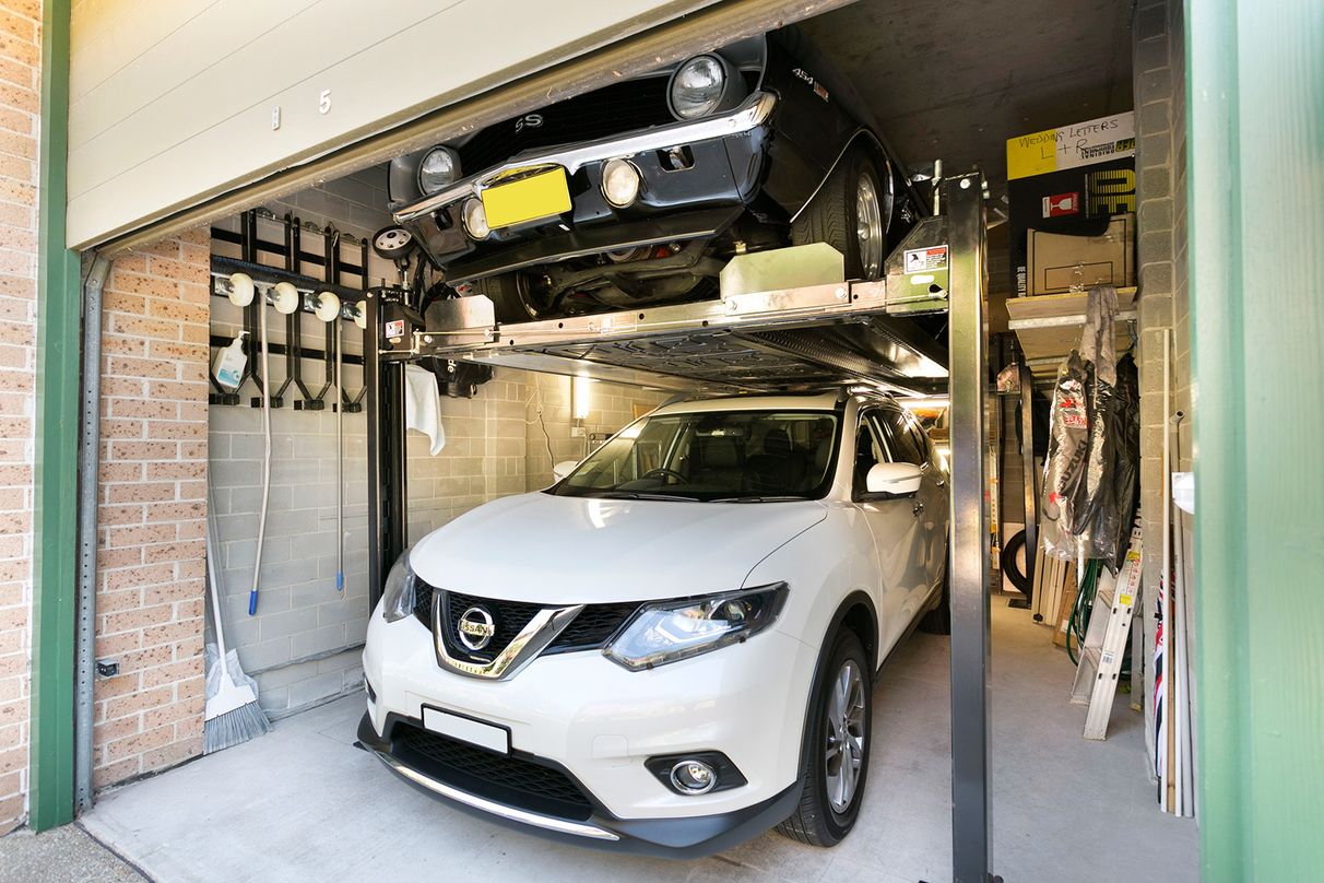 accommodates a car hoist - enables parking for two cars,
