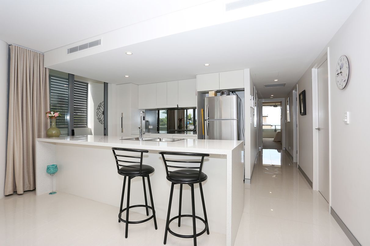 The designer kitchen is the centrepiece of this superb residence, equipped with a full range of SMEG appliances including electric oven, induction cooktop, range hood, integrated dishwasher and microwave, 40mm Caesar-stone waterfall benchtops, designer tapware, abundant storage and glass slider opening to the balcony.