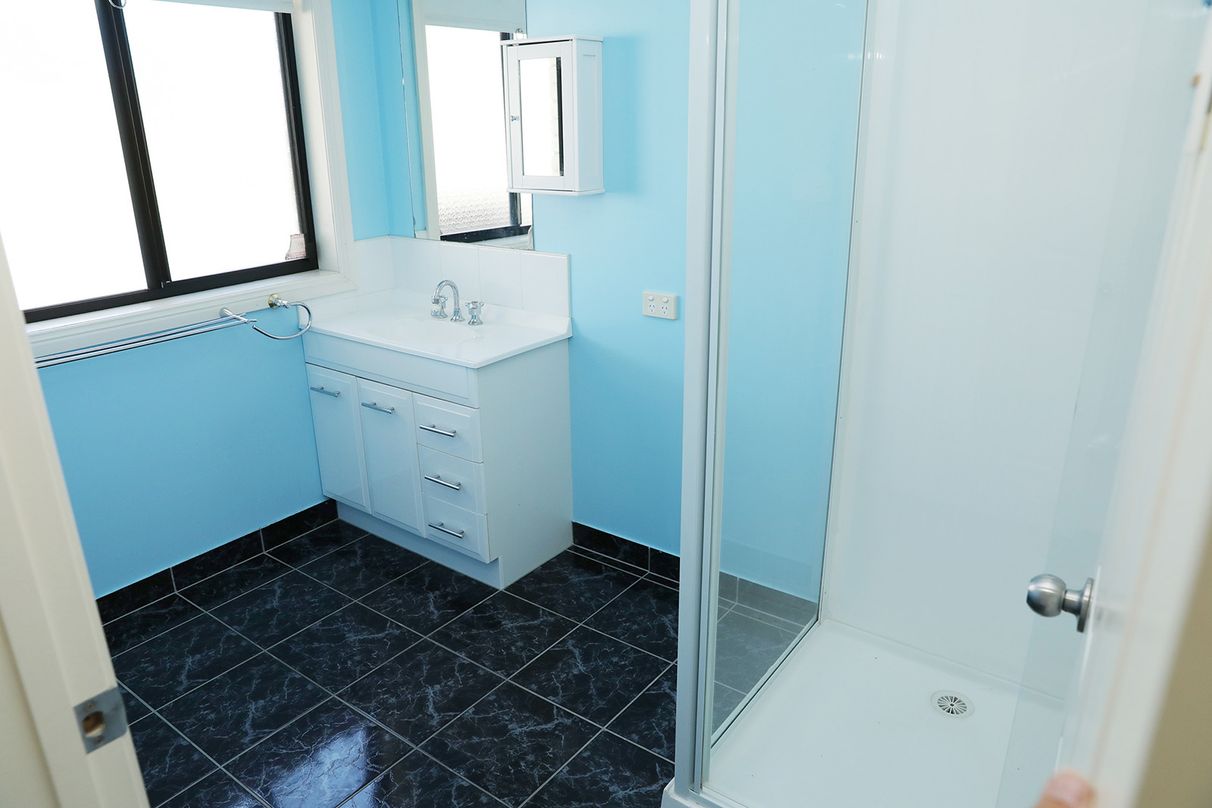 A modern bathroom with a shower, separate toilet and a separate laundry - all closely accessible to the two bedrooms with built-in-robes.