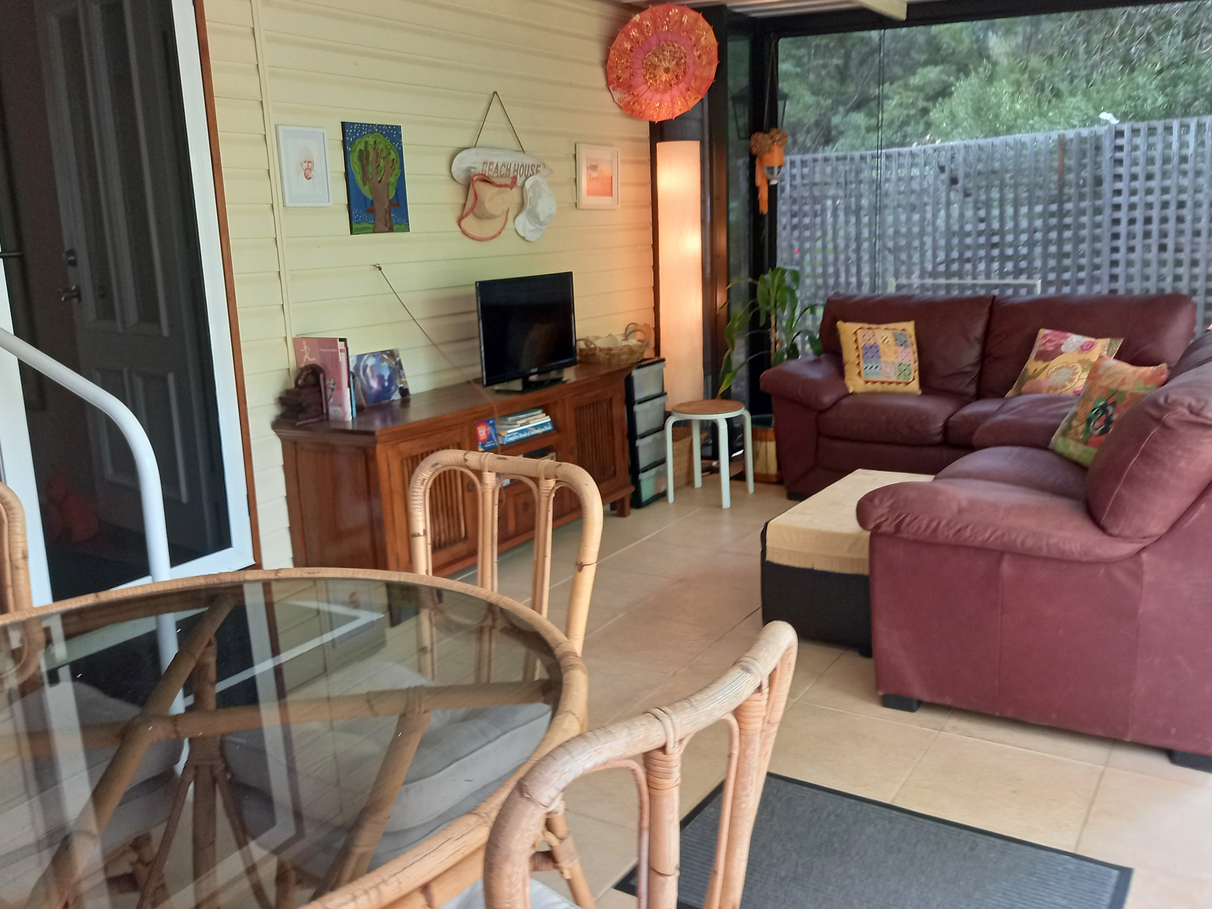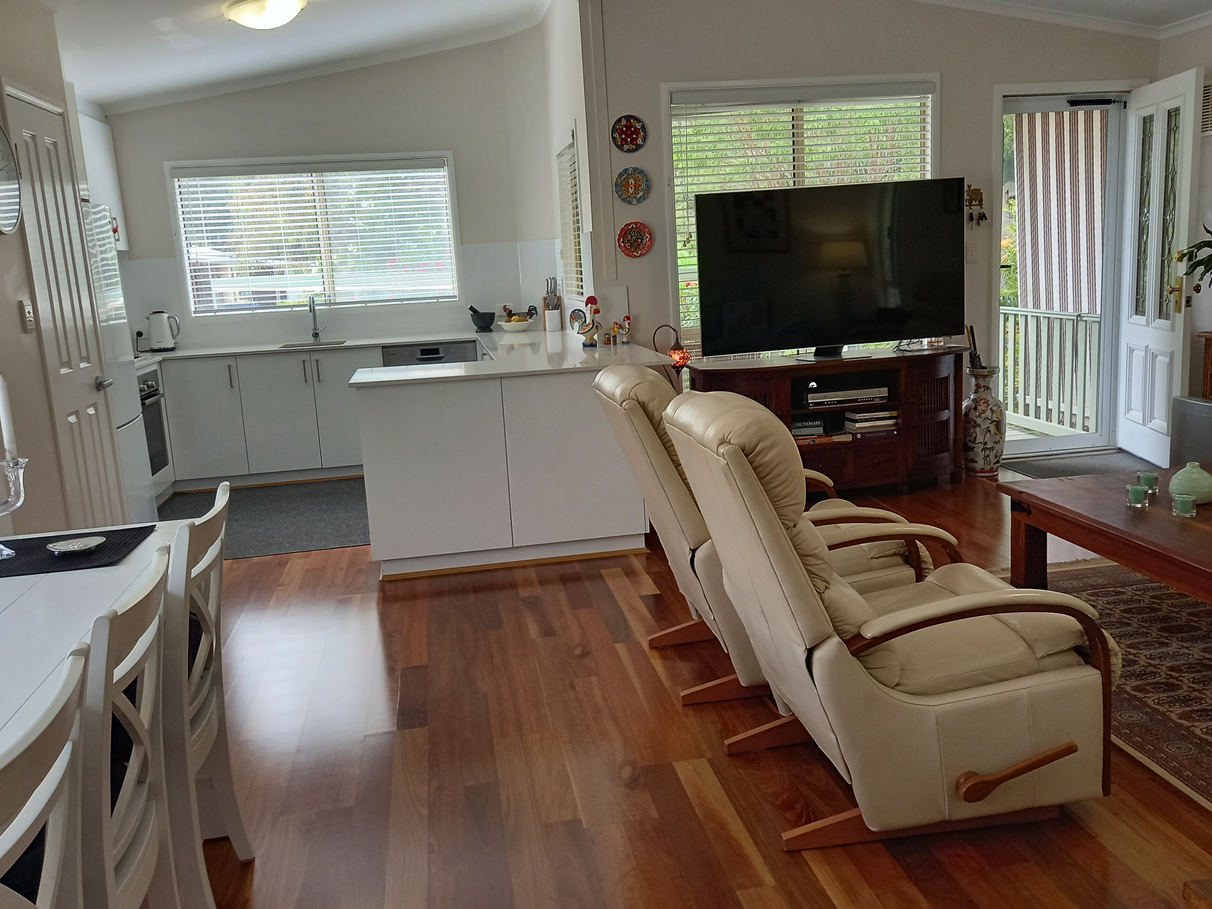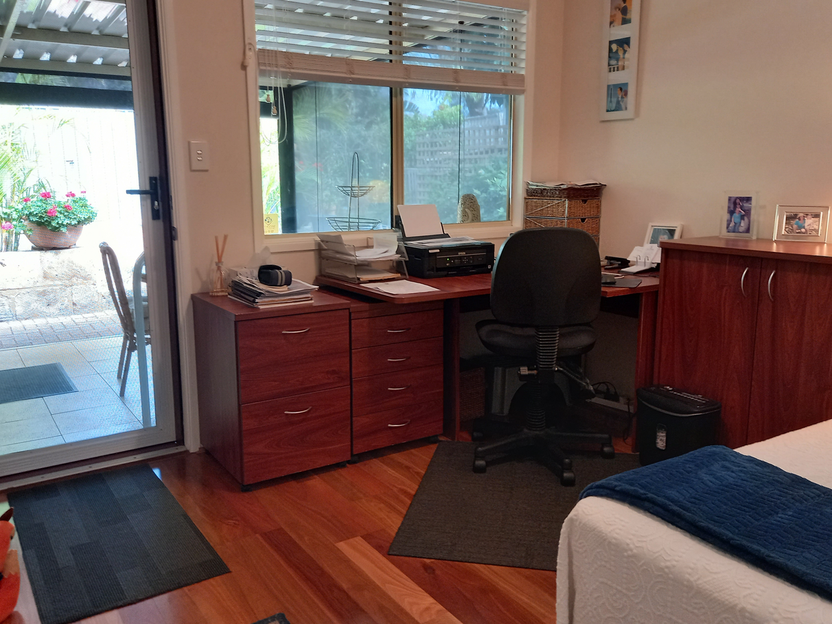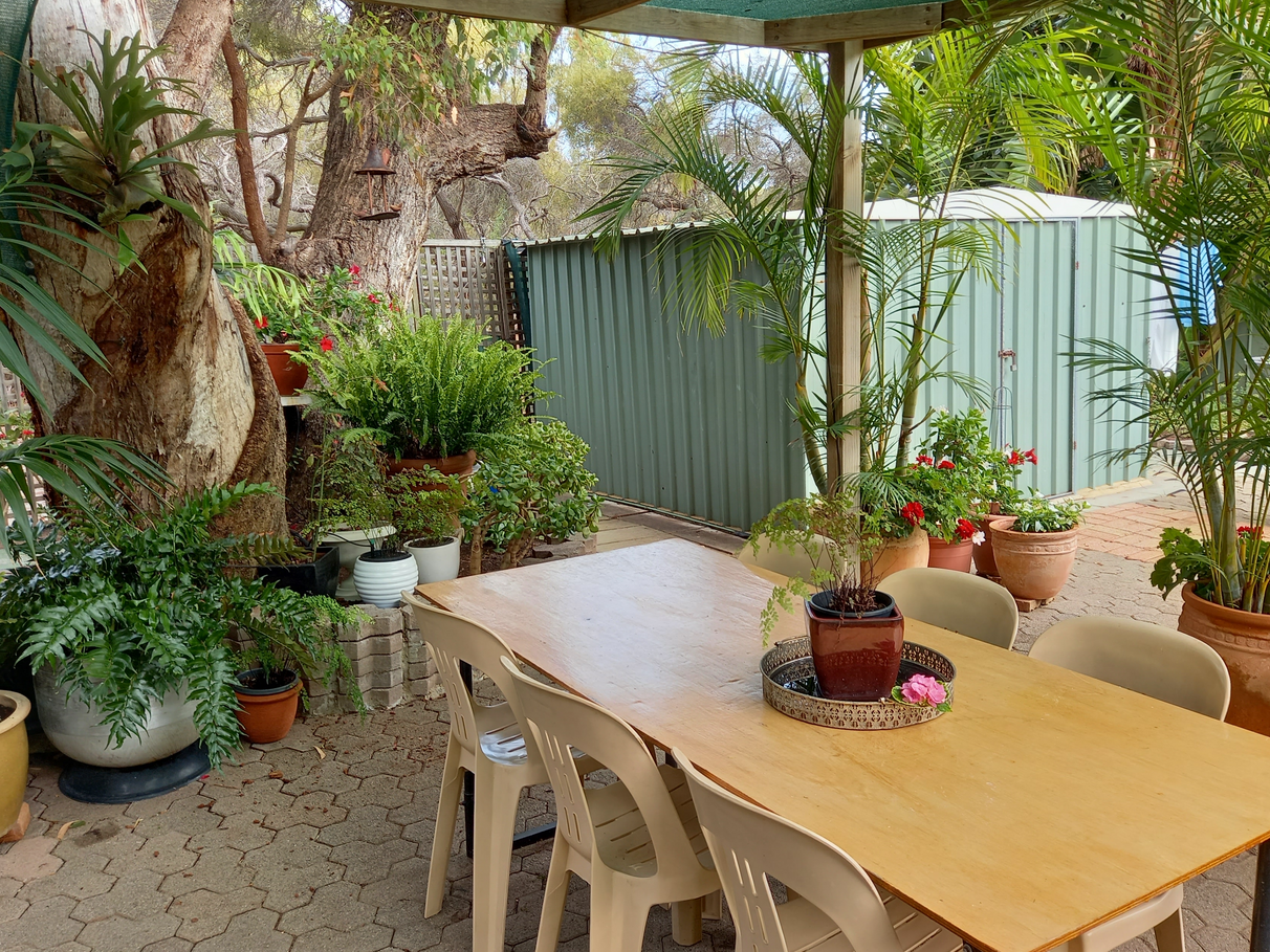 1 bed, 1 bath, study, 2 toilets, sunroom with zip-up blinds, carport, pergola, lush garden and shed.