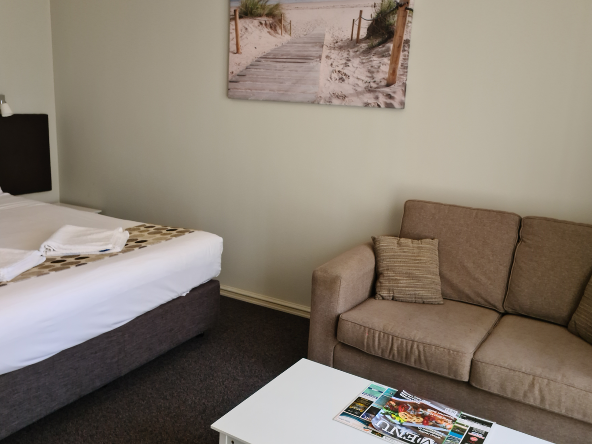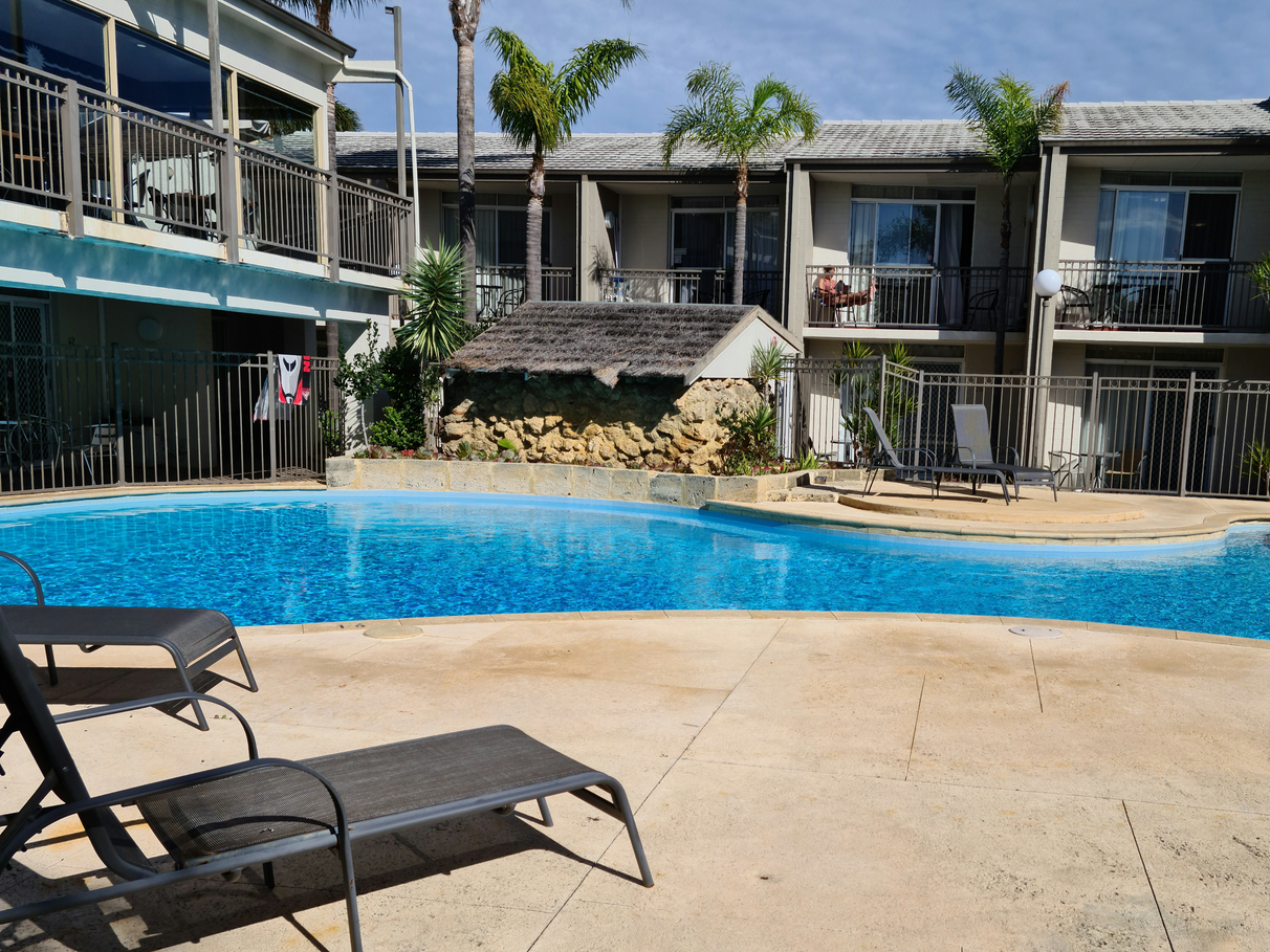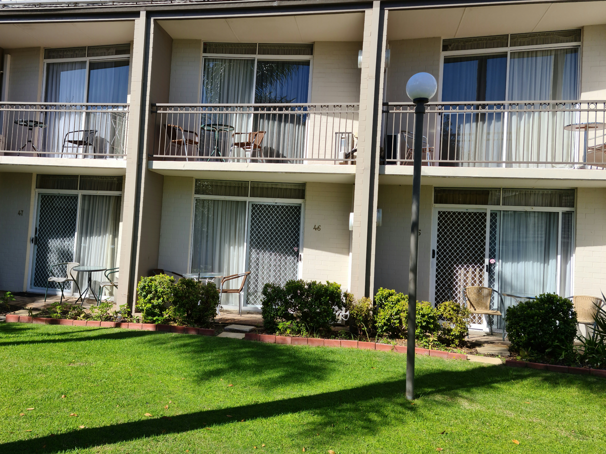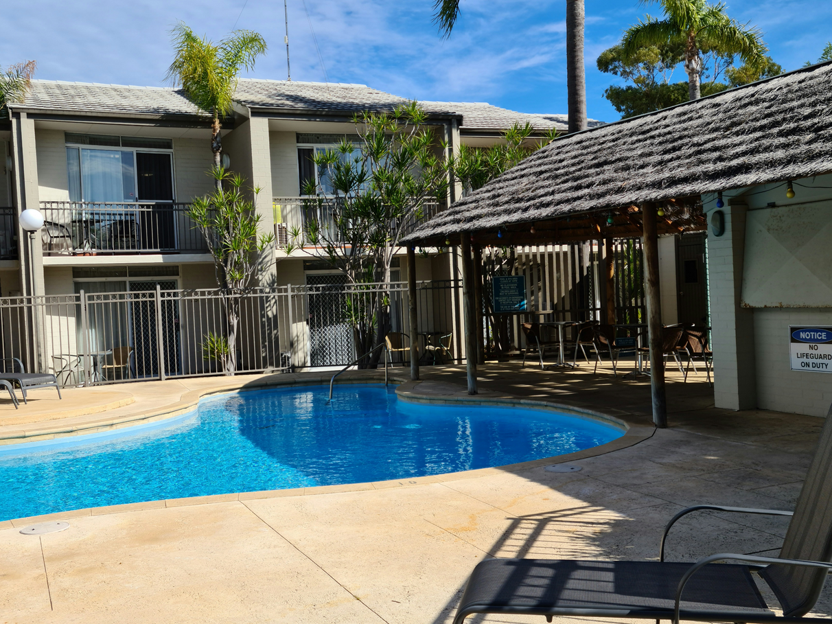 Neat 1 bedroom 1 bathroom ground floor strata holiday unit inside Mandurah Motel and Apartments resort. There's a swimming pool, mini golf, and tennis court as well as the popular Sunbreakers restaurant.