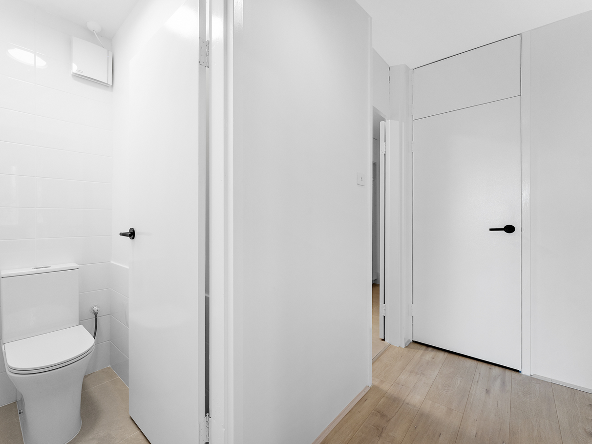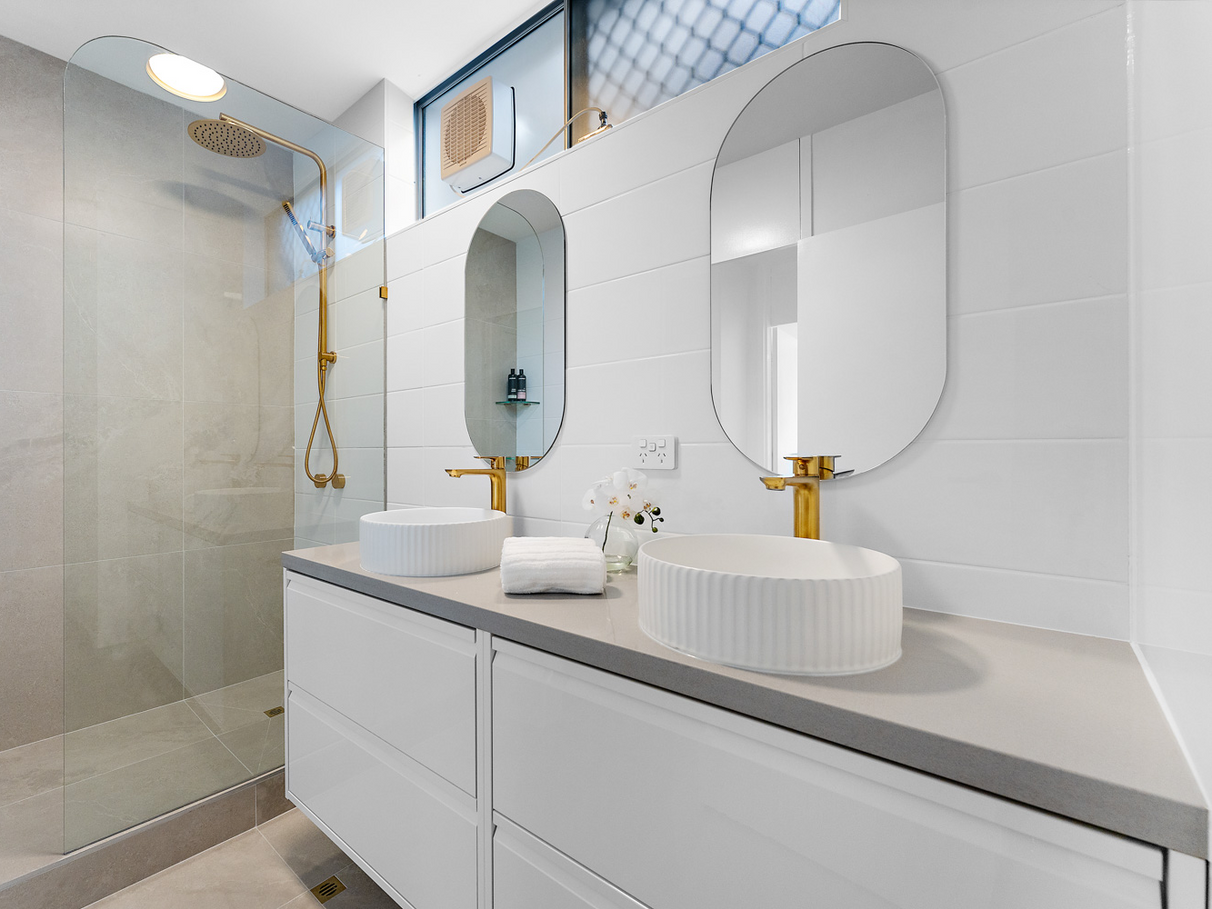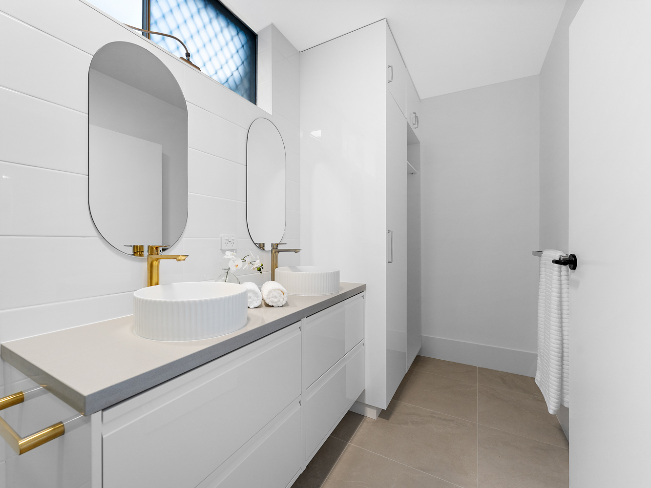 The brand new, modern bathroom boasts a step-in shower with rainfall feature as well as a stone-topped double vanity and plenty of storage. There is even space to fit a washing machine and dryer in the built-in storage.