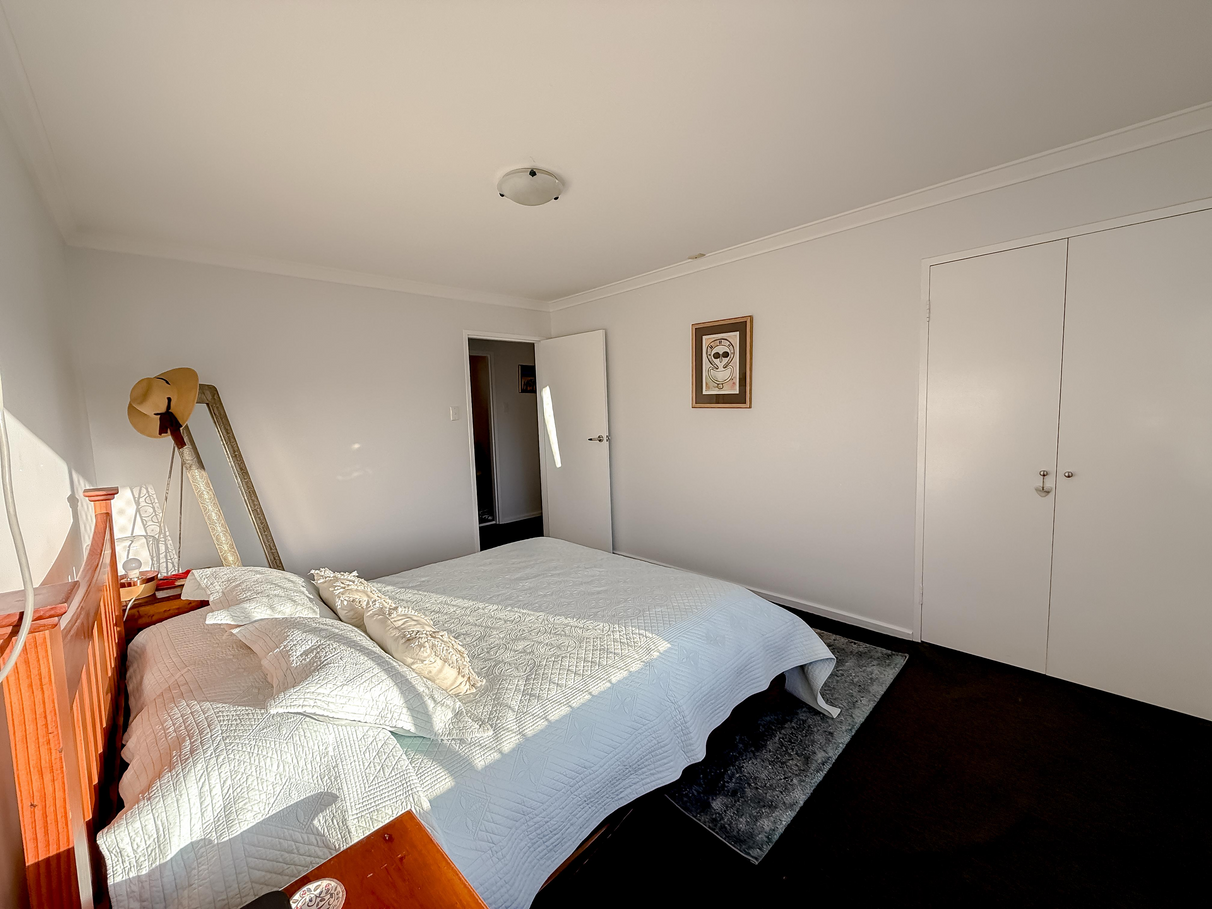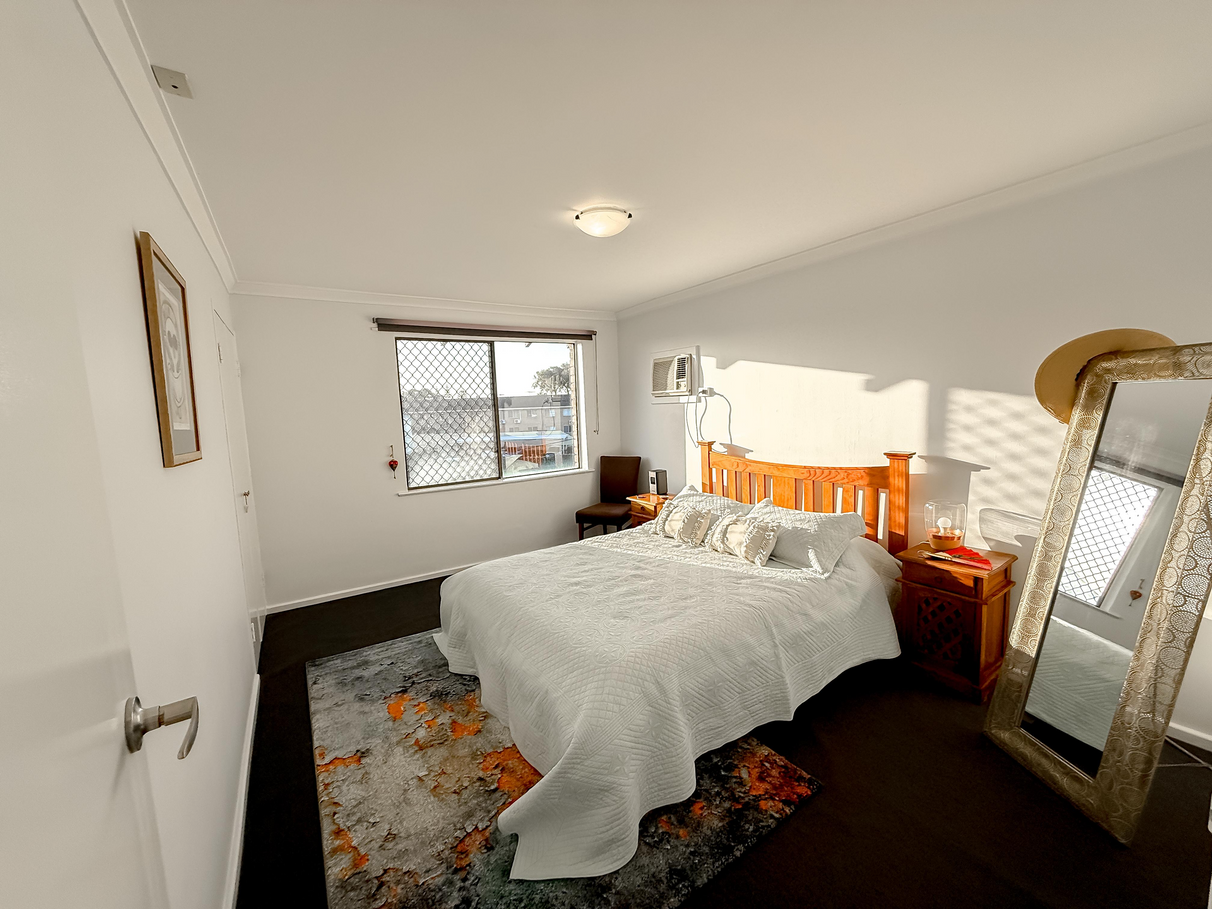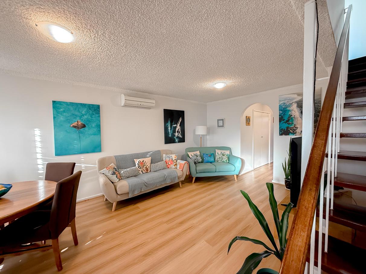 Downstairs features an open-plan living space with reverse cycle air conditioning, a spacious kitchen, and a low-maintenance private rear courtyard ideal for entertaining. Upstairs, the oversized master bedroom easily fits a king-sized bed with built-in robes and air conditioning, while the second bedroom fits a double bed with side table. A well-proportioned bathroom completes the upper floor.