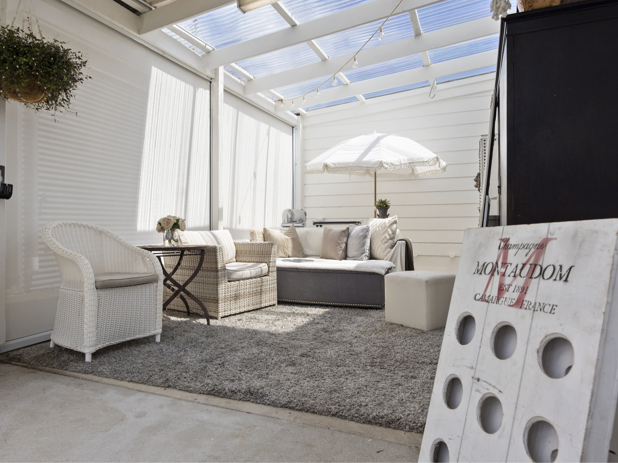 The kitchen offers modern convenience with induction cooking, granite benchtops, and dishwasher, flowing through to a fully enclosed sunroom enhanced with clear electric café blinds and security shutters — perfect for year-round enjoyment.